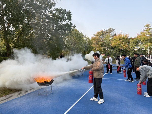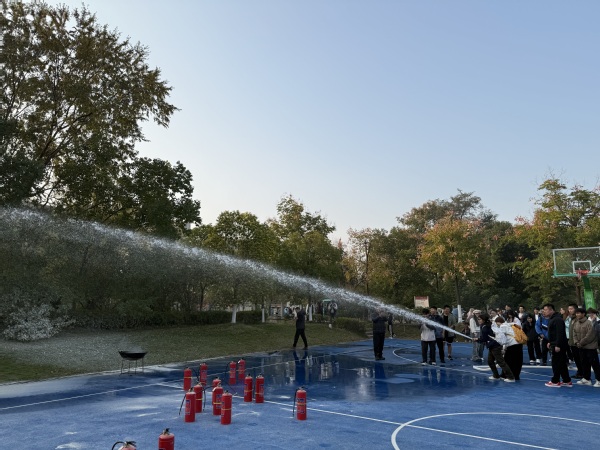 随后,在保卫处专业人员的指导与协助下,师生有序进入篮球场指定安全区域开展实操演练。现场模拟设置了多个着火点,师生代表分批上前,亲身体验了使用手提式干粉灭火器扑灭明火的全过程。部分同学还进行了消防水带连接与射水练习,整个过程紧张有序、互动充分。