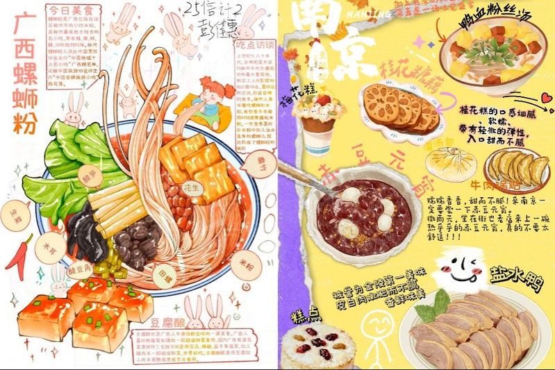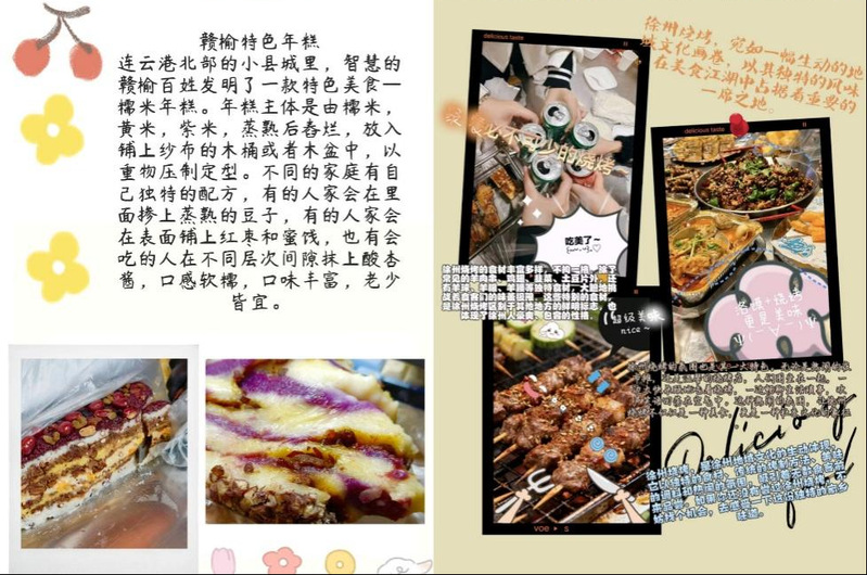 晒家乡味,共融文化之情:家乡特产分享,为来自五湖四海的学生搭建了情感与文化交融的平台。同学们通过精美海报、手账日志、散文随笔等形式,生动介绍了广西螺蛳粉、赣榆年糕、徐州烧烤等各地美食及其背后的文化故事。在分享中,大家不仅交流风味,更诉说乡情,在美食与故事的温暖传递中深化了对不同地域文化的理解,营造出包容多元、情感相连的学院氛围。