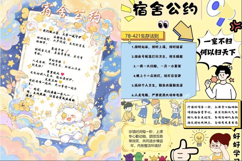 一纸公约,共筑文明之基:各宿舍围绕作息制度、值日安排、学习氛围等展开充分讨论,以手绘海报、电子设计、平板绘画等形式,创作出兼具创意与可行性的“宿舍公式”。这些公约不仅设计新颖、内容务实,更体现出同学们自我管理、共建文明的自觉意识,为和谐宿舍建设奠定了制度基础。